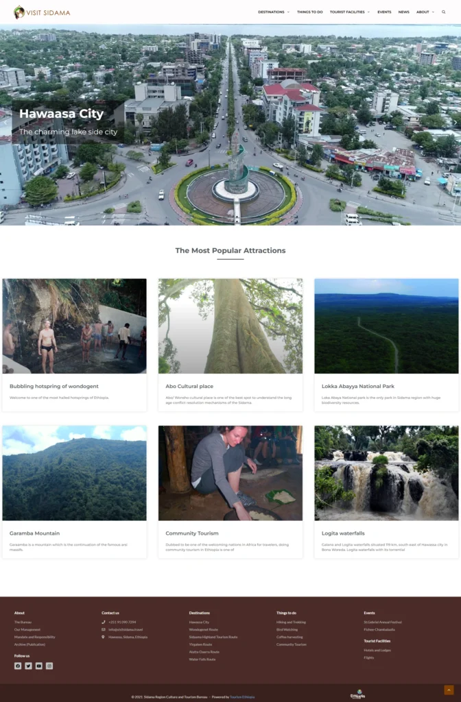 VisitSidama.travel is the official tourism website for the Sidama Region Culture and Tourism Bureau, designed to promote the region’s unique cultural, historical, and natural attractions. Our goal was to create an engaging, user-friendly platform that highlights Sidama’s diverse tourism offerings, from its rich cultural heritage and festivals to its stunning landscapes and eco-tourism destinations. The website features an easy-to-navigate layout, vibrant visuals, and detailed information about tourist sites, accommodations, events, and local culture.
